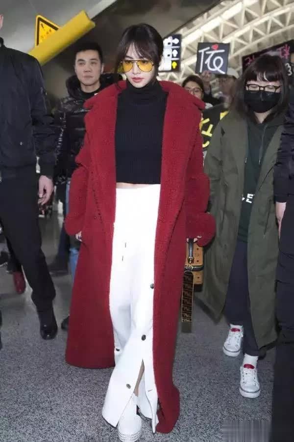 蔡依林成都演唱会结束后穿着一件大红色的泰迪熊绒大衣,身高只有一米五多的她气场确实很强大,不过对于小个子来说,大这件大衣明显在拖地了。长款大衣最好是在脚踝以上,穿着就很拉风,但这件可以帮机场阿姨拖地的衣服简直就是搭配灾难。